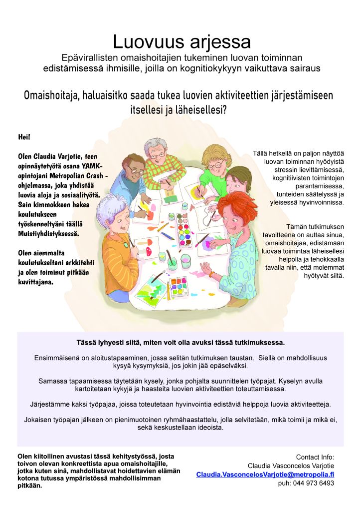 Claudia Varjotie has a master’s degree in Creativity and Arts in Social and Health Fields. Her thesis’ topic is on how informal caregivers can be supported to promote creative activities to their dementia care recipients in a way that the dyad feels the benefits of engaging in such activities. Stress relief is one of the greatest reasons people seek creative activities.