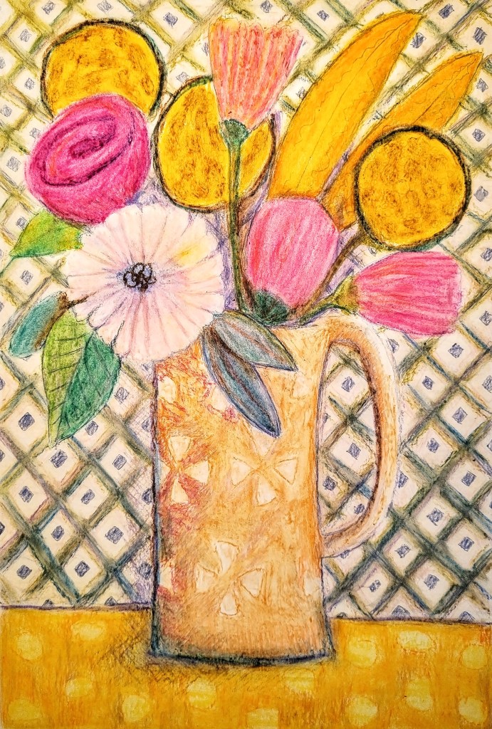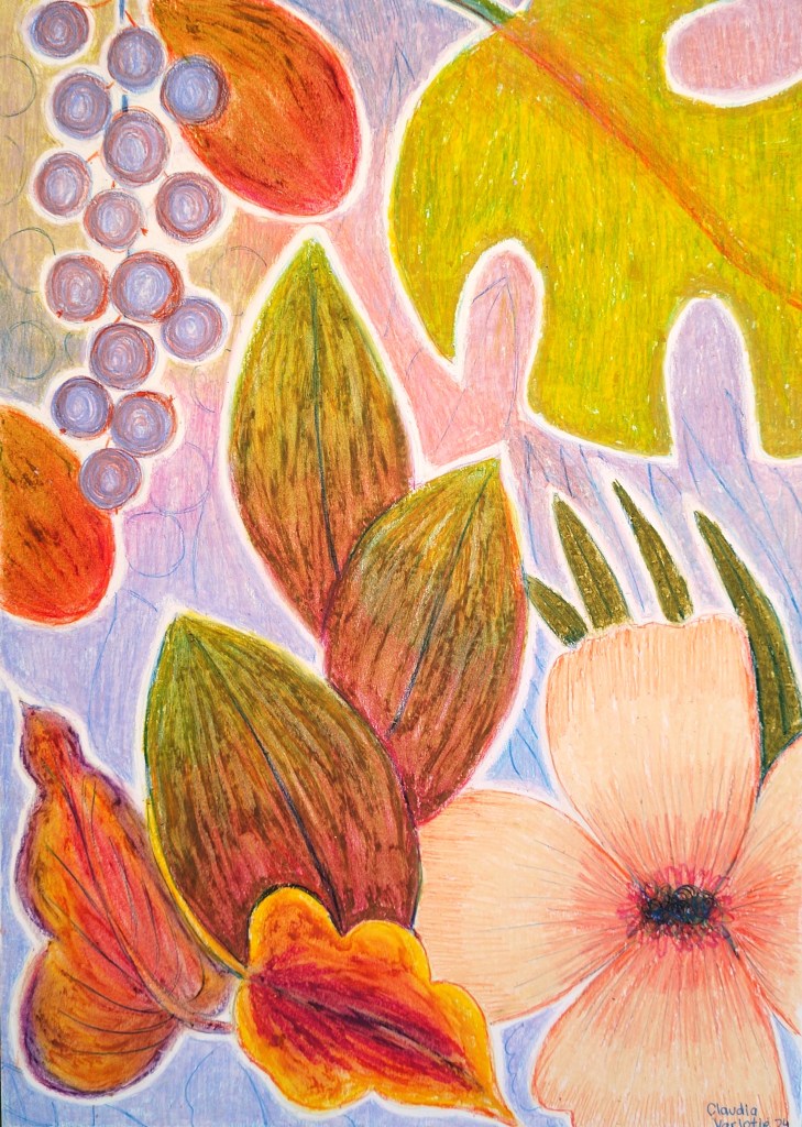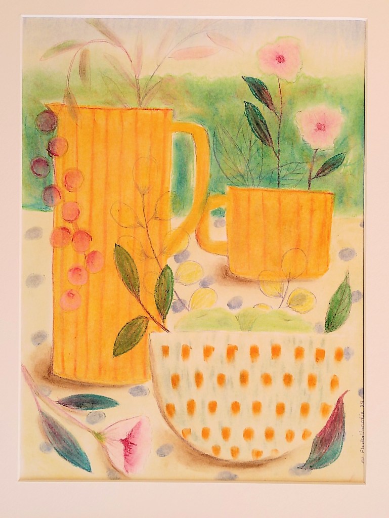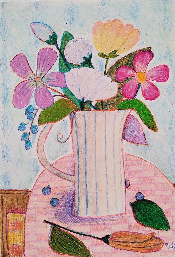 Tender Contemplation is a collection of works inspired by colours, shapes, flowers, leaves, birds in soft and oil pastels, colouring pencils, watercolour, collage, and acrylic paint. It portrays the beauty of simple things. The intention in each work is to elevate the spirit and take the spectator to that cozy time and place in memory, like a childhood moment when looking at grandma’s table with fresh-cut flowers or listening to a bird chirping on the fence on a calm rainy day.